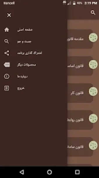 De اپلیکیشن قوانین is een educatieve applicatie die gebruikers toegang biedt tot de wetgeving van het Iraanse rechtssysteem. Deze app bevat een uitgebreide verzameling van wettelijke artikelen, waardoor het voor gebruikers eenvoudiger wordt om relevante informatie te vinden zonder dat zij hiervoor dure en tijdrovende boeken hoeven aan te schaffen. De applicatie is ontworpen voor Android en is gratis te downloaden, wat het toegankelijk maakt voor een breed publiek.